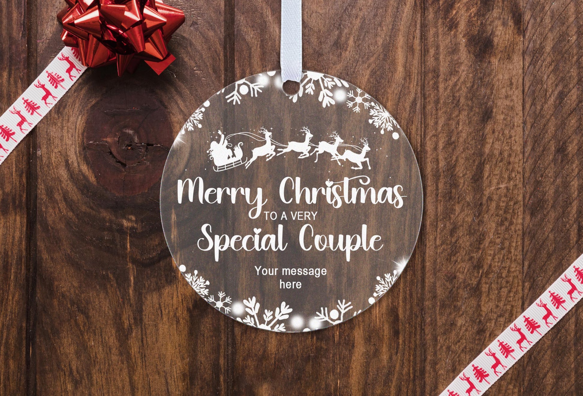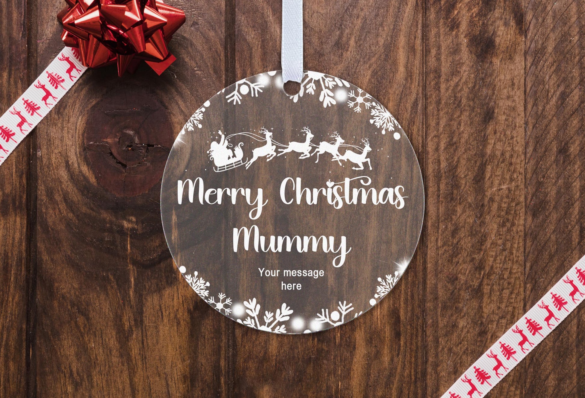 Introducing our elegant Xmas bauble ornament, crafted from high quality Perspex and measuring 80mm x 80mm. This beautifully subtle piece is perfect for adding a touch of sophistication to your home décor. It comes adorned with a delicate white ribbon, making it ready to hang, and can be thoughtfully presented in a gift box, making it a perfect gift for any occasion.
