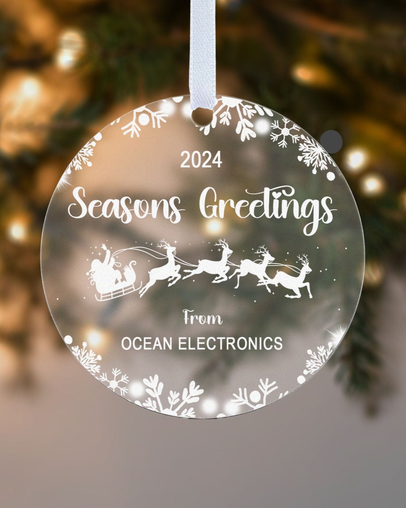 Check out our elegant Xmas business gift bauble ornament, crafted from high quality Perspex and measuring 80mm x 80mm. This beautifully subtle piece is perfect for adding a touch of sophistication to your home décor. It comes adorned with a delicate white ribbon, making it ready to hang, and can be thoughtfully presented in a gift box, making it a perfect gift for any occasion.