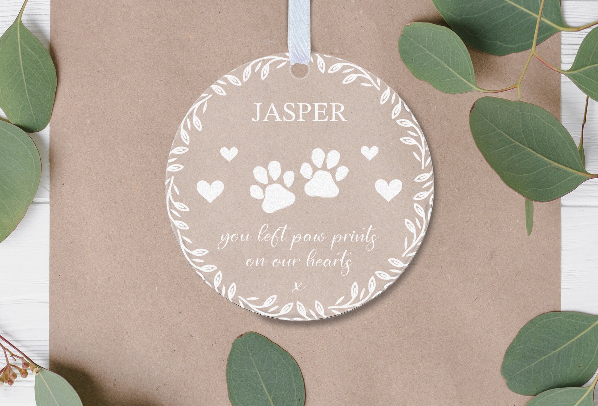 Featuring an illustrated paw prints & the phrase 'you left paw prints on our hearts'. Designed and crafted from our cosy design studio, here in the New Forest, UK.